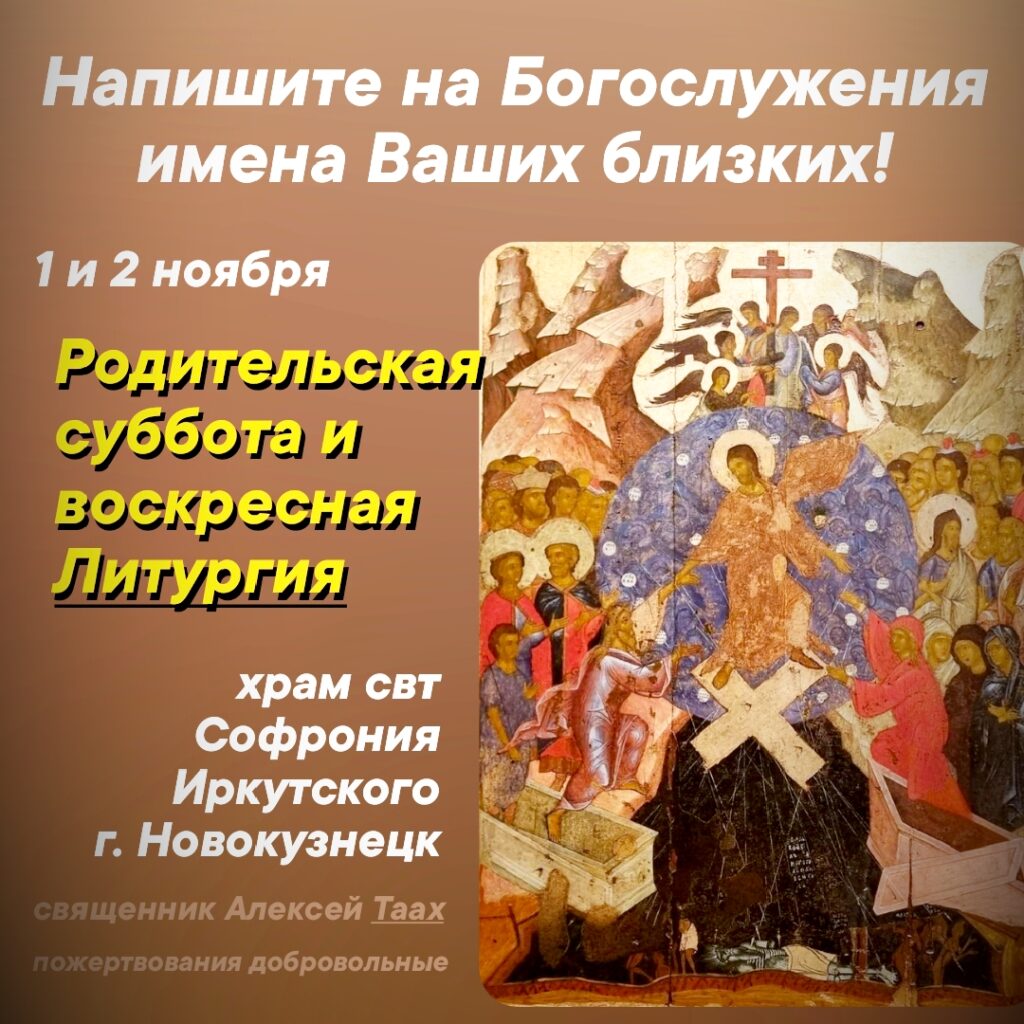 Возлюбленные во Христе братья и сестры, службы в нашем храме будут в субботу и воскресенье, 1 и 2 ноября: Дмитриевская родительская суббота и воскресенье, память вмч Артемия Антиохийского